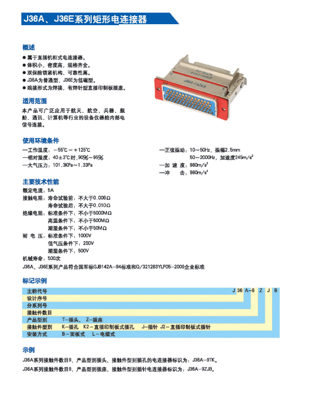 J36A,E矩形航空接插件,執(zhí)行Q/HD20038-2007詳細(xì)規(guī)范,屬于儀器式電連接器。具有體積小、密度高、規(guī)格齊全、雙保險(xiǎn)鎖緊結(jié)構(gòu)、可靠性高等優(yōu)點(diǎn),端接形式為焊接式和直插印制板式。廣泛應(yīng)用于航天、航空、兵器、艦船、通訊、計(jì)算機(jī)等行業(yè)的設(shè)備儀器艙內(nèi)部電信號連接。