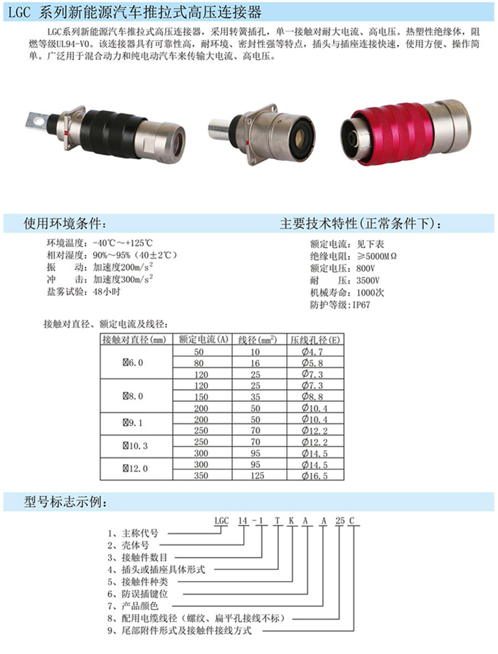 YGC(CT34D)單芯推拉200A電連接器,該連接器有兩種鏈接方式,卡口式和推拉式,接觸件單芯,6mm,8mm,9mm,10mm,12mm粗插針,插座有線鼻子固定,螺絲固定,壓接式固定。電流達80A,125A,150A,200A,250A不等。同一組或同一排有紅、黃、藍、綠、黑區(qū)分,防止誤插,尾部防水防層。