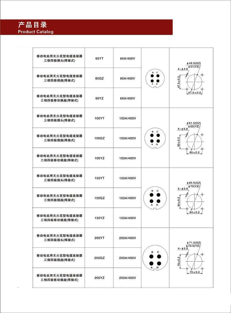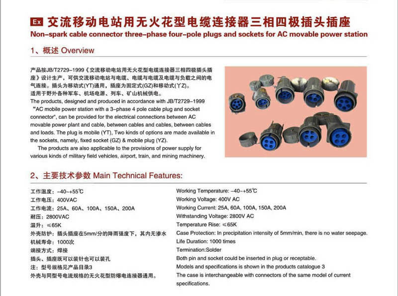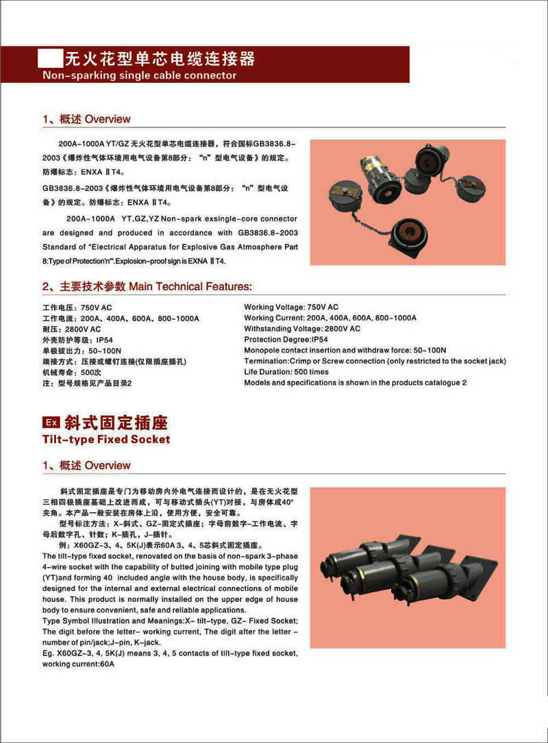 該系列產(chǎn)品是低壓低電流防爆連接器,由插頭和插座兩部分組成,其中插頭為移動(dòng)式(YT),插座有3種形式選擇:①面板固定式(GZ)、②移動(dòng)式(YZ)和③斜式固定式。