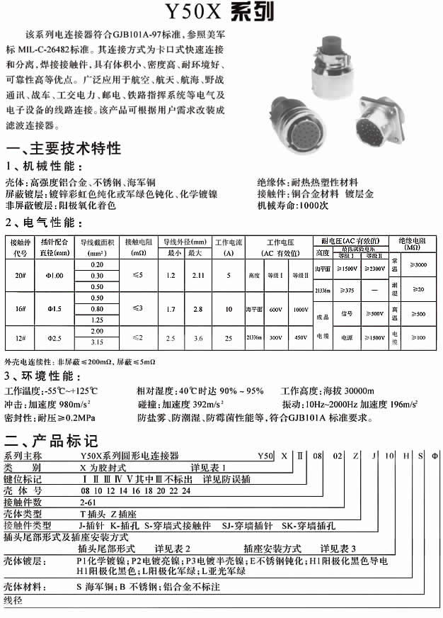 Y50PD屏蔽式耐高溫圓形電連接器,參照GJB101A-1997,MIL-C-26482標(biāo)準(zhǔn),是Y50X擴(kuò)展產(chǎn)品,且同一殼體號(hào)的插頭插座安裝尺寸可以互配,其連接方式為卡口式快速連接和快速分離,焊接接觸件,傳輸電流大,具有獨(dú)特的負(fù)載連接和分離的特點(diǎn),廣泛應(yīng)用于各種電站、電氣設(shè)備之間的線路連接。
