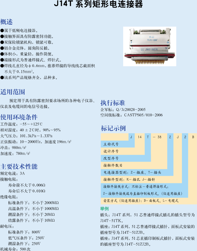 J14T矩形電連接器執(zhí)行Q/HD20037-2007詳細(xì)規(guī)范,屬于推拉式電連接器,規(guī)格齊全,有9,15,27,36,51等五種芯數(shù),端接形式為導(dǎo)線壓接式,頭座均有線纜引出,廣泛應(yīng)用于航天、航空、兵器、艦船、通訊、計(jì)算機(jī)等行業(yè)的設(shè)備儀器艙內(nèi)部電信號(hào)連接。